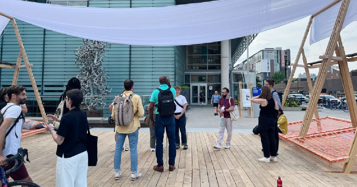 (首圖圖說:ACE 為北美合作教育的知識中樞,也成為國際合作社聯盟(ICA)與美洲合作組織(Cooperatives of the Americas)間的協作橋樑。今(2025)年7月,ACE與ICA合作研究委員會安排了一場參訪活動,包含參觀都市設計師合作社Le Comité的作品。Le Comité位於蒙特利大學校區,因此也招募大學生實習。圖中呈現三個學生的作品,用木造結構來模擬大樹,以布幔產生樹蔭的效果,且以木地板提供人們坐下、欣賞街景和人群的空間。這樣的木造結構可以簡單裝卸,重複部署,低成本的改變了公共空間的屬性。(圖片來源/萬尹亮教授))