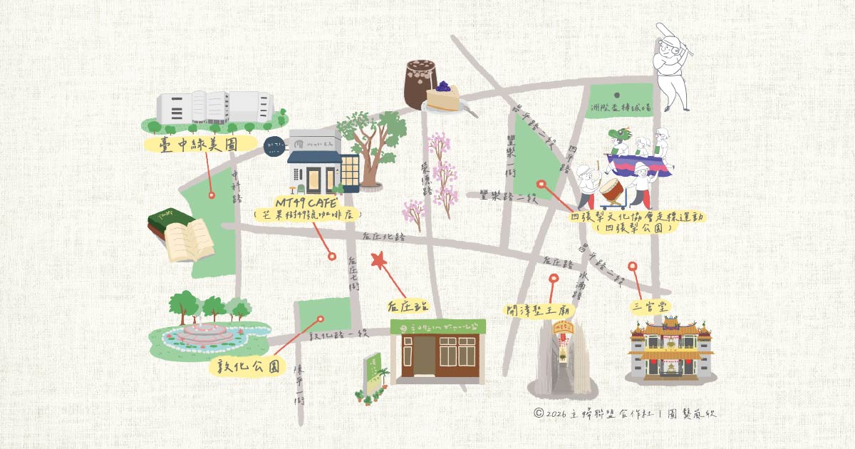 鄰近洲際盃棒球場、臺中綠美圖,后庄站仿佛是都市叢林中靜謐的存在。后庄站在地理位置上擁有豐盛的文化資產,就讓我們來瞧瞧哪些地方有合作社人熱情參與的身影吧!臺中綠美圖(景點)