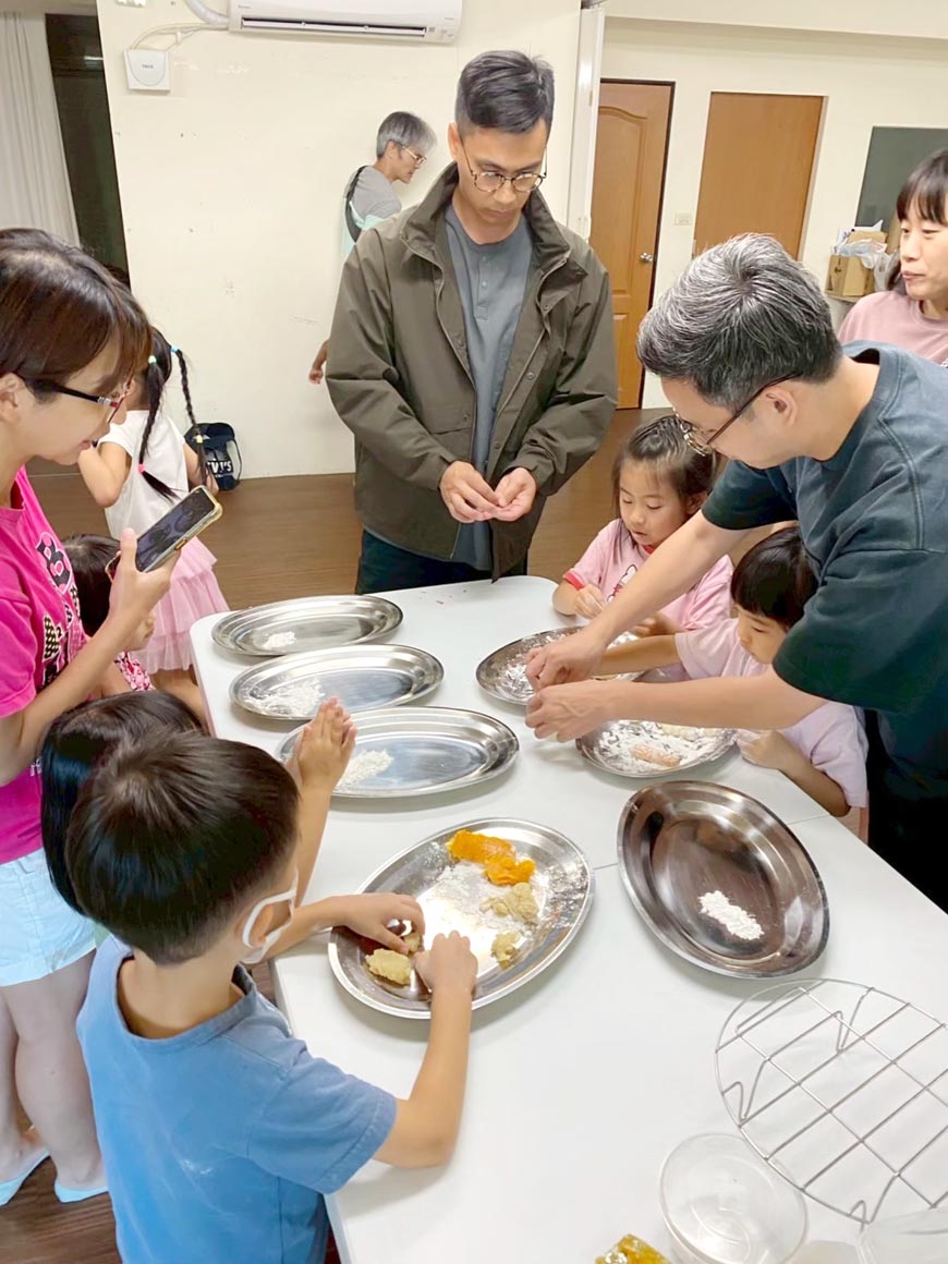 從2023年「招募」永康站萬萬老師,來到海安站帶來的科學料理課開始──讓孩子了解原來料理就是由一個個有趣的「化學反應」組成,課程一推出便獲得熱烈回響。到了2024年,冬、夏令營也加入了食育課程,帶著孩子認識五穀、肉品與蔬菜,辨識不同食材來源的差異;再讓孩子一起參與午餐備料,洗菜、捏肉丸,親手感受食材的樣貌與溫度。2025年,區委更邀請在地小農走進教室,帶著孩子認識農村生活與生態環境,最後再加上一場點心DIY,讓孩子從產地到餐桌,嚐到最簡單也最純粹的食物滋味。透過擔任綠食育志工,我也能跟著孩子們從《阿福種田》這本可愛的繪本中,了解到農夫的辛苦及不安,也感受到早期農村社會互相幫忙的人情味。來自佳里的農夫:映蓉老師,從一開始榨紅蘿蔔汁就與孩子們打成一片,也利用圖片、聲音讓孩子更能感受田中生態。活動中端出的DIY「米糕」,雖然小小的出槌(沒有熟透,趕快再加熱),但拿到米糕的孩子還是興高采烈地壓模、塑形、當黏土玩,除了有各式各樣的白兔及紅蘿蔔外,竟然還捏出雞母蟲的造型!更誇張的是,米糕香氣撲鼻,孩子們竟邊捏邊吃,作品完成也瞬間就吃完了,實在是讓身邊的大人們都笑彎了腰。