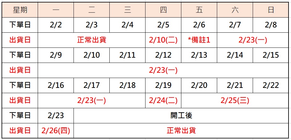 - 2/11(三)~2/22(日)暫停出貨,春節期間完成的訂單將於2/23(一)起陸續出貨。