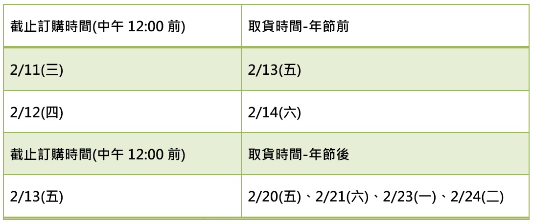 - 因春節前訂單配送量較大,為確保社員們訂購的生鮮品質,並配合廠商(第三方物流)作業,春節前最後出貨日為2/10(二),當日僅處理2/6(五)9:00前完成的訂單。
