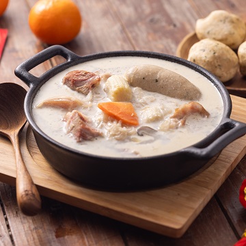 | 產品說明 | 過年豬腳的西式新吃法,今年的圍爐就以酸菜豬腳燉鍋來圍爐吧 1.酸菜豬腳湯是歐嬤餐廳內最受歡迎的例湯之一,同樣來自德國婆婆家傳配方加以改良為更適合台灣人的口味。 2.主廚以豬、雞混合的肉骨加上多種蔬菜一起熬製高湯基底,再添入鮮奶油及酸奶,使湯頭香醇溫順,層次豐富鮮美(可依個人喜好調整風味) 3.德籍主廚特製了減添加的巴伐利亞白腸及南德麵包球,將麵包球撕開蘸著湯一起吃,幸福爆表。 |