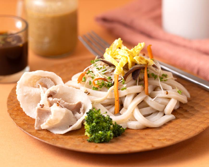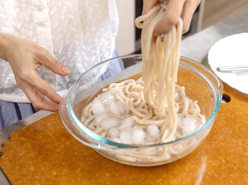 1. 烏龍麵清燙1到2分鐘後撈起,立即放入冰水沖洗,接著裝盤備用。