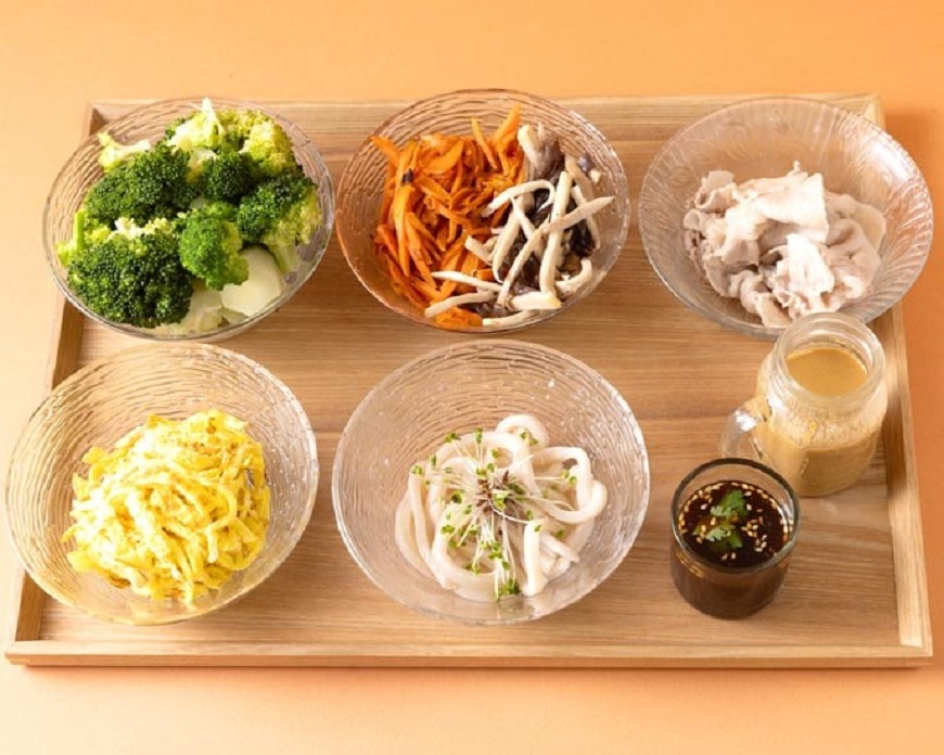 2. 雞蛋打散煎成薄片放涼,切成細絲;小黃瓜洗淨切絲、三日青花椰苗洗淨;紅蘿蔔、黑木耳、杏鮑菇洗淨後切絲炒熟;青花椰菜洗淨後,切成適合入口大小,與五花肉片分別汆燙。以上備用。